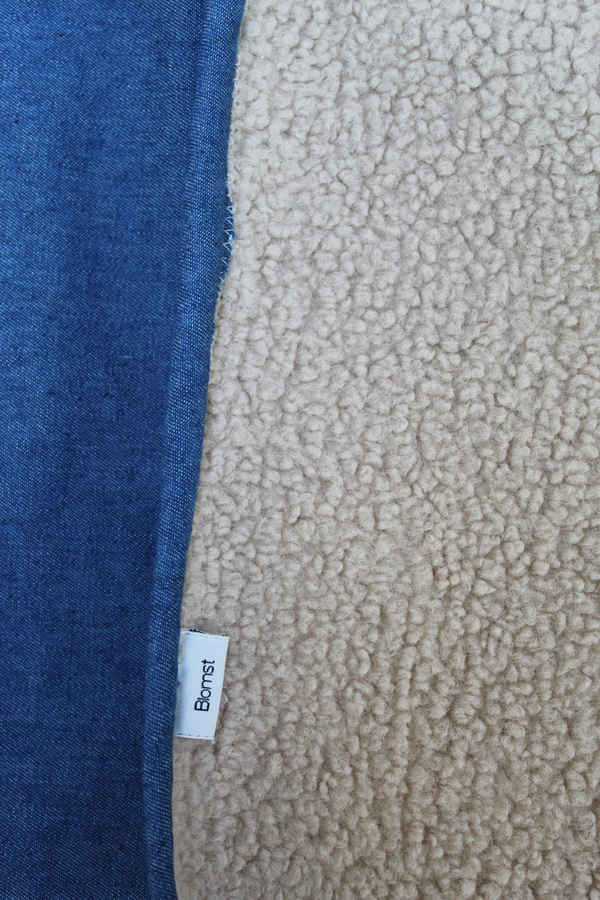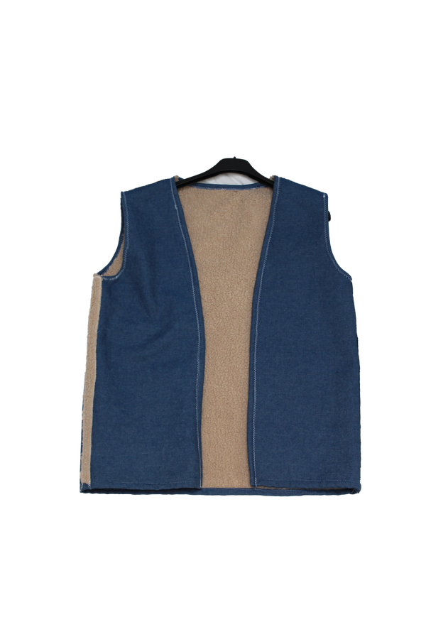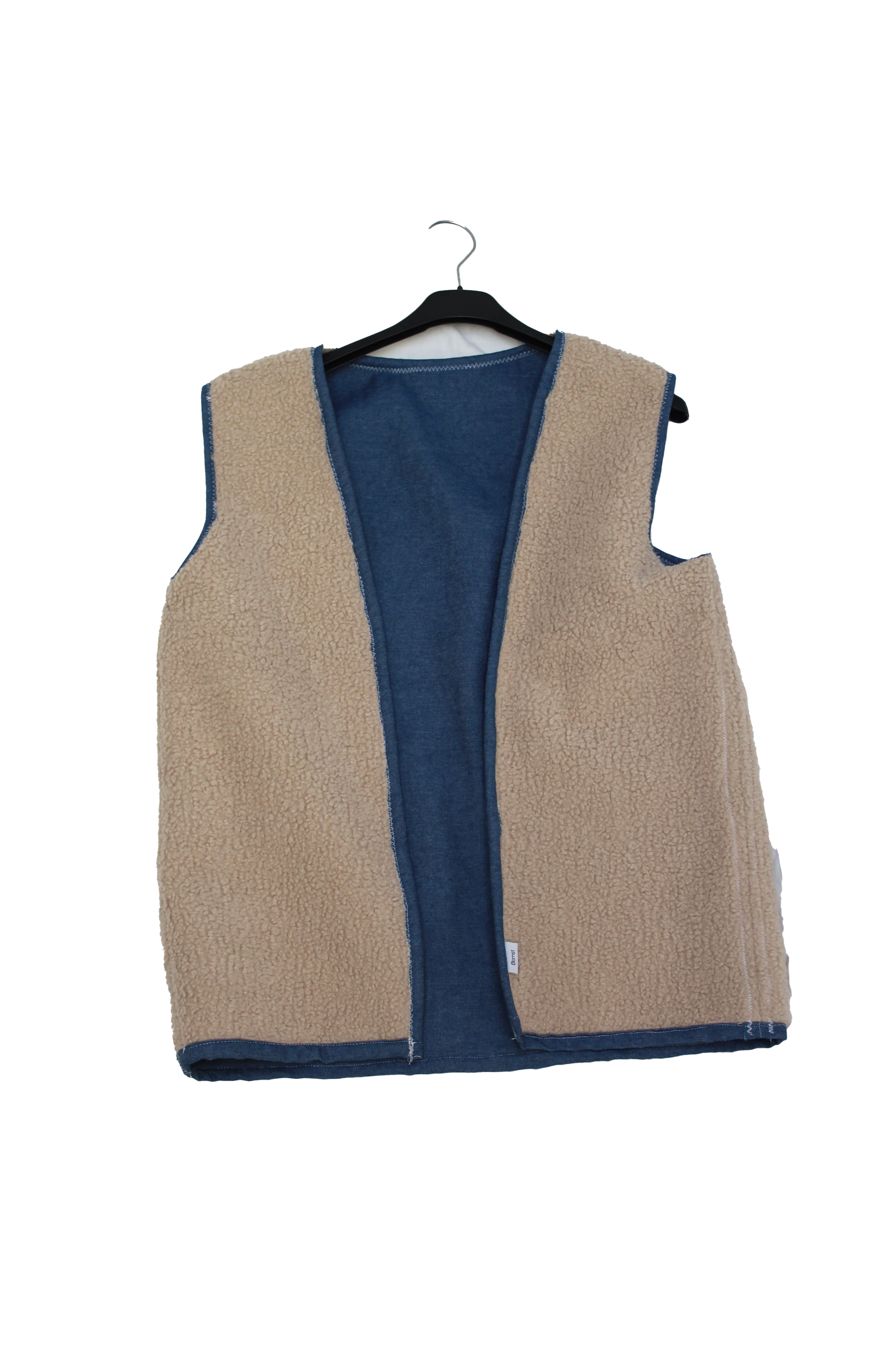 Gilet met zachte teddy buitenkant en denim binnenkant, aan twee kanten te dragen. Maat S/M.