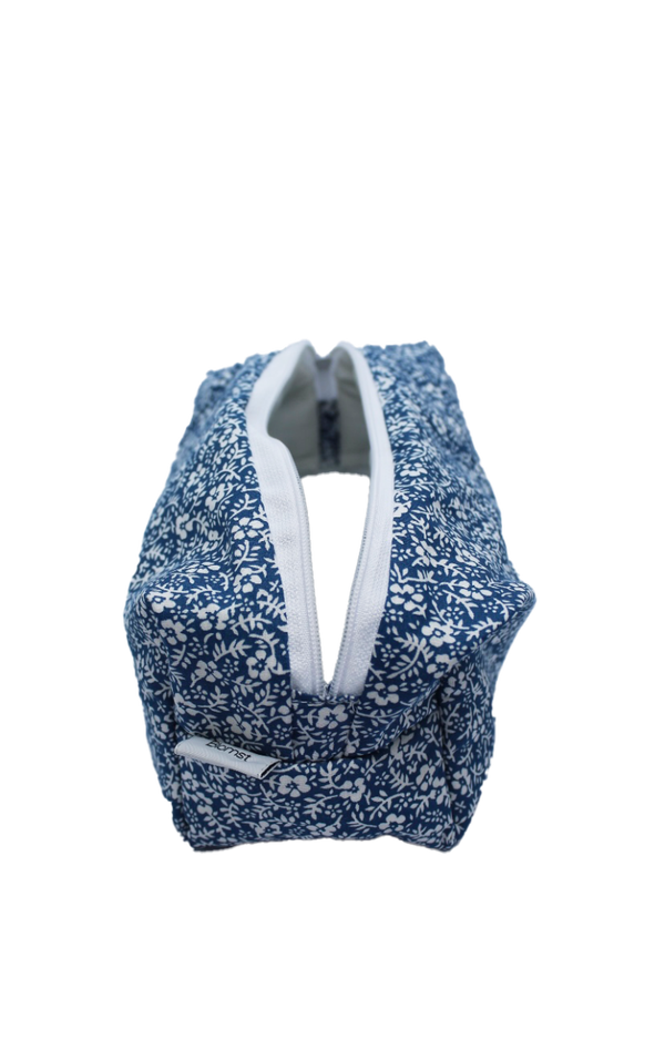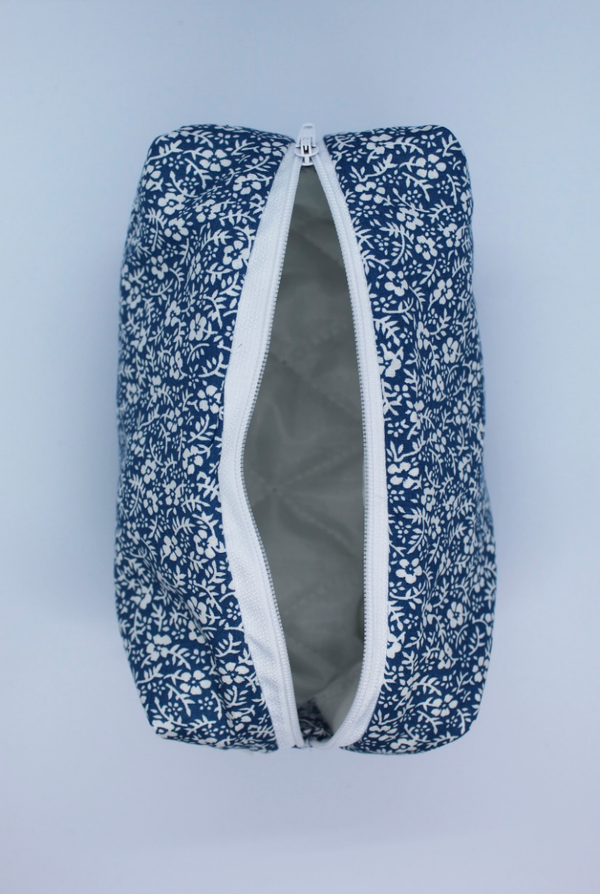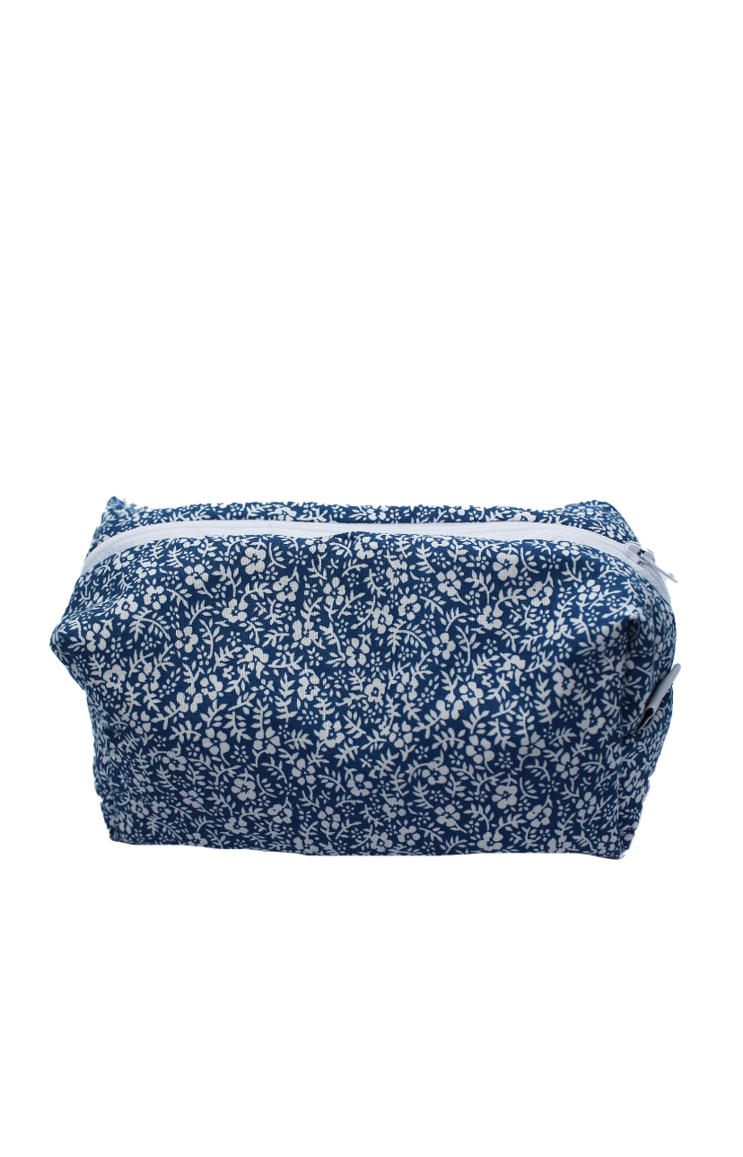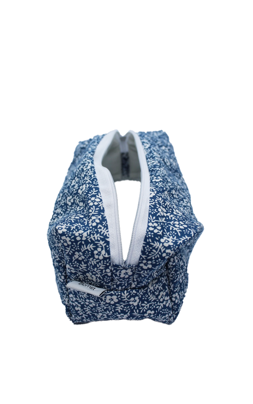 Toilettas/Etui met blauwe bloemen. Binnenkant is gewatteerd.