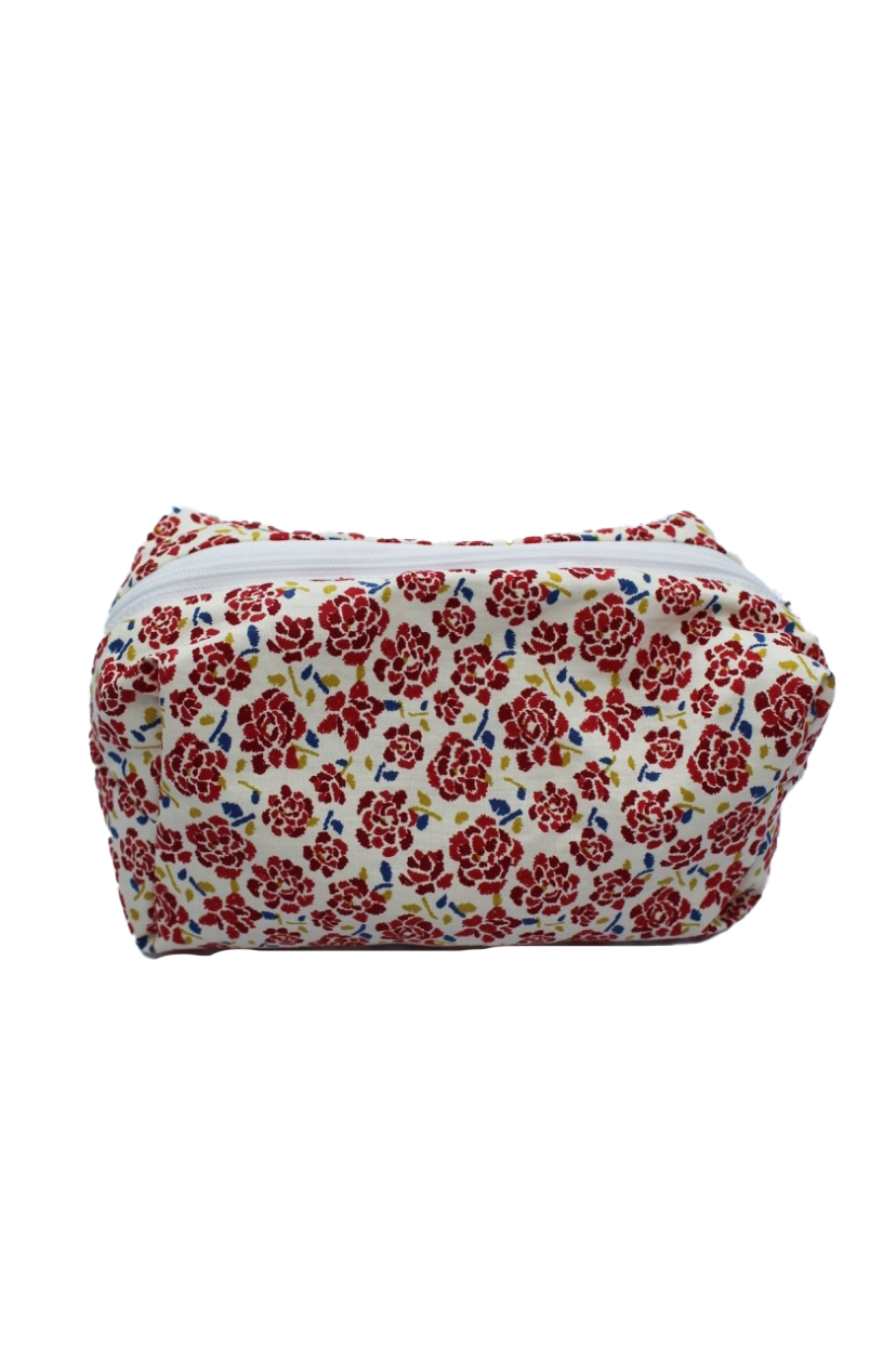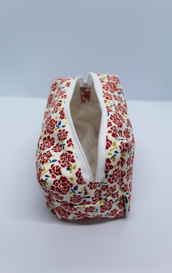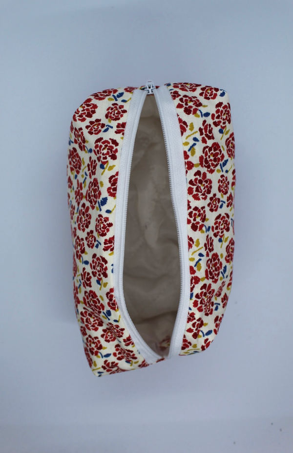 Toilettas/etui met rode bloemen. Binnenzijde is gewatteerd.