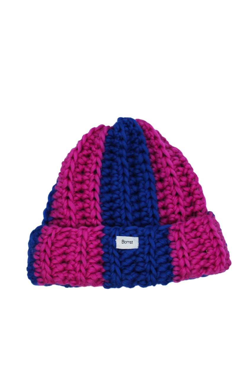 Handgehaakte beanie met dikke strepen. Gemaakt van 100% wol.