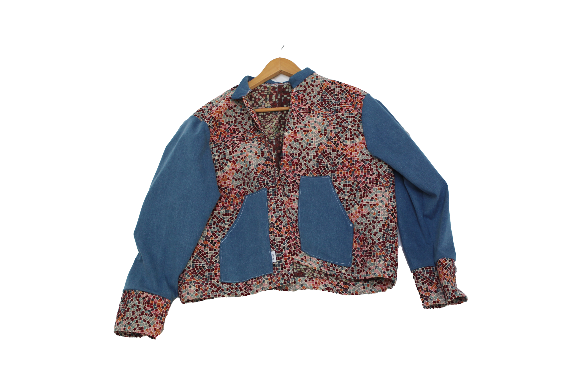 Handgemaakte jas gemaakt van gordijnstof en jeans. Boxy fit.