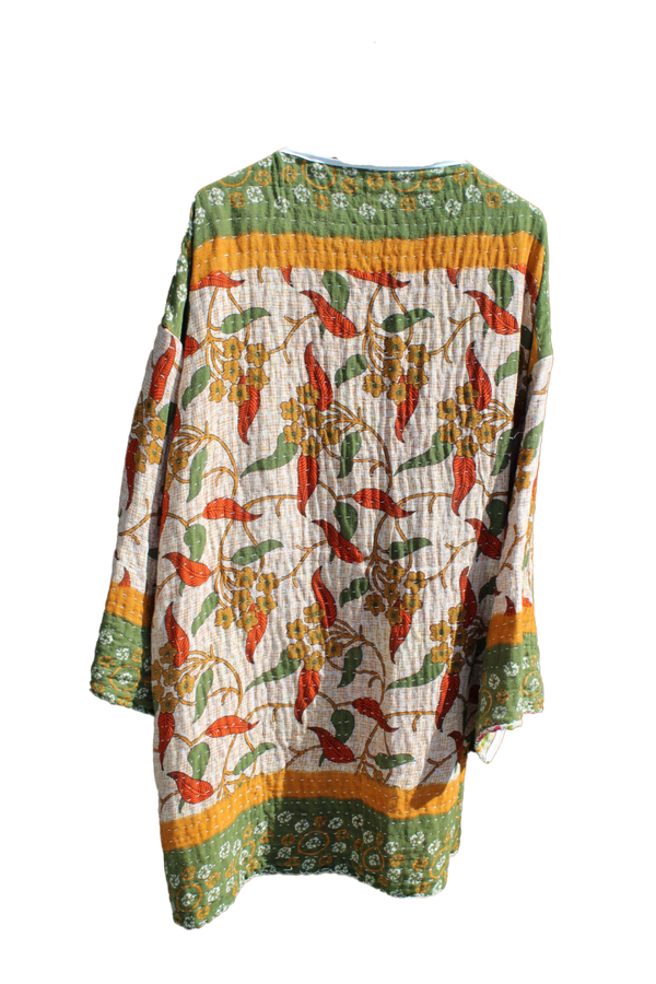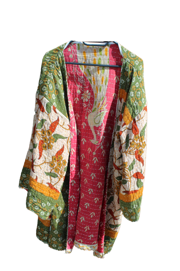 Jasje gemaakt van gerecyclede Indiase sari's, aan twee kanten te dragen.