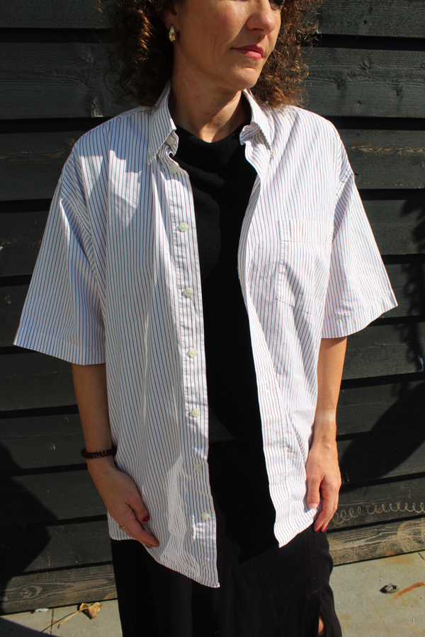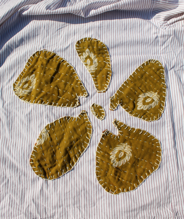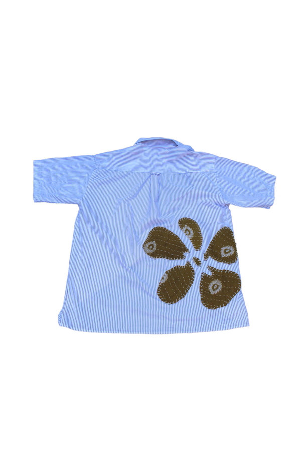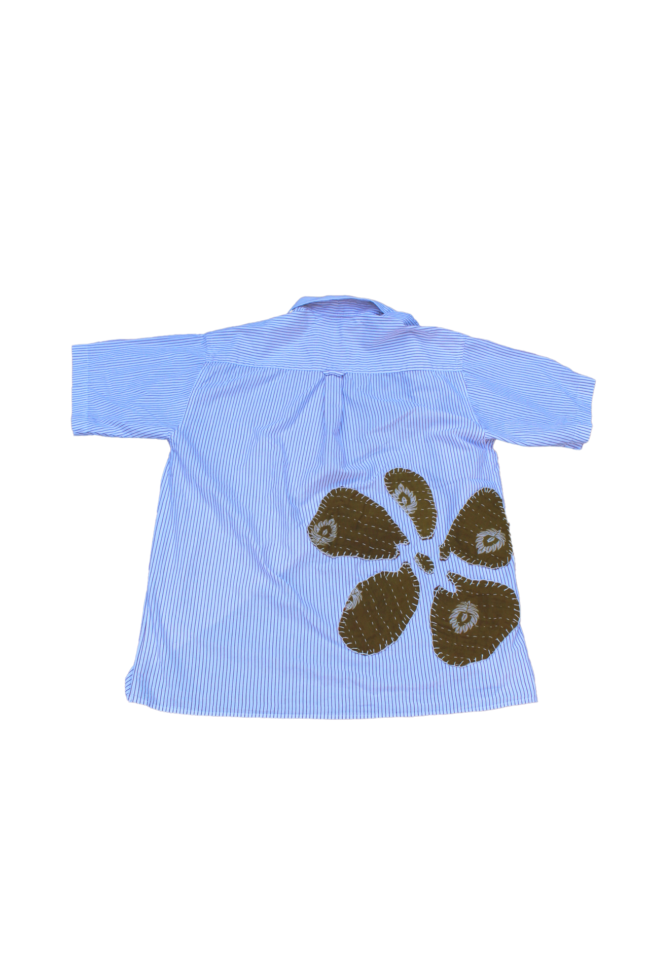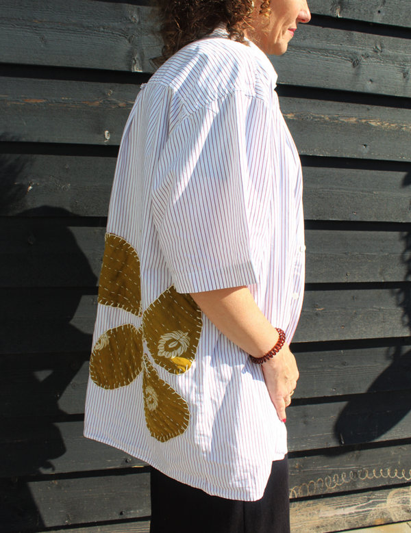 Vintage shirt, met bloem erop geborduurd. De stof is gemaakt van vintage gerecyclede Indiase sari's.